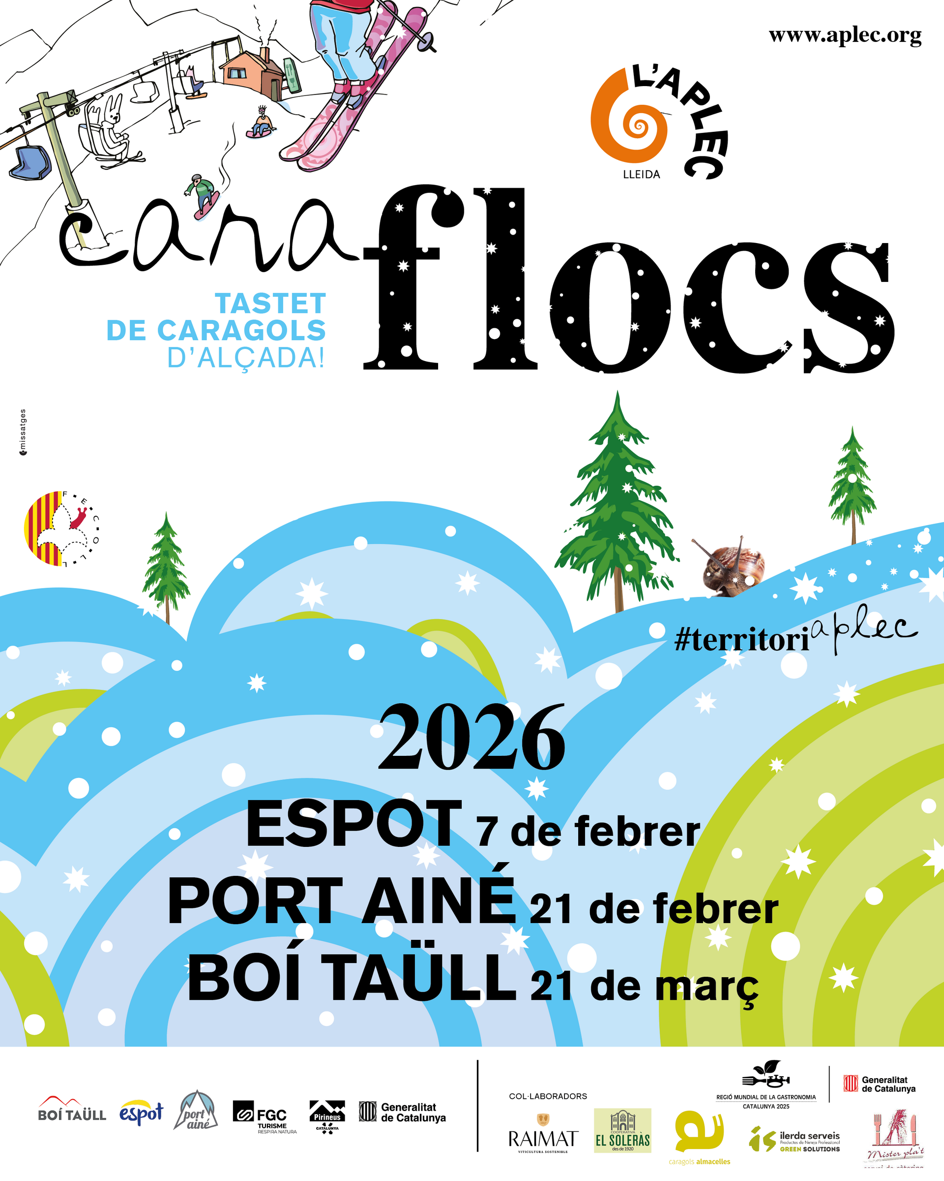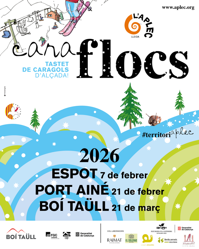 Tres són les caragolades a la neu que la Federació de Colles de l’Aplec del Caragol de Lleida (Fecoll) ha programat aquest 2026: Espot (7 de febrer), Port Ainé (21 de febrer) i també a Boí Taüll (21 de març).