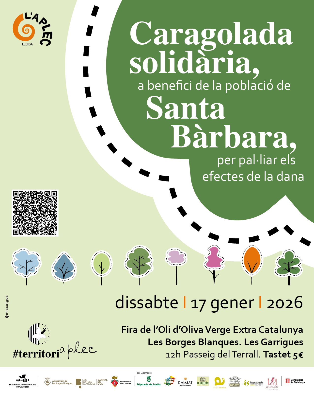 La Caracolada Solidaria del sábado 17 de enero se organiza conjuntamente con el Ayuntamiento de Les Borges Blanques, la Feria del Aceite de Oliva Virgen Extra Cataluña, el Ayuntamiento de Santa Bárbara y la campaña Región Mundial de la Gastronomía Cataluña; una acción a la que la Fecoll está adherida como entidad de utilidad pública. Una iniciativa que forma parte de la estrategia #TerritoriAplec de la Fecoll que celebra actividades en toda la provincia para aprovechar los flujos de visitantes y, al mismo tiempo, apoyar y dinamizar otros eventos y espacios de las Tierras de Lleida.